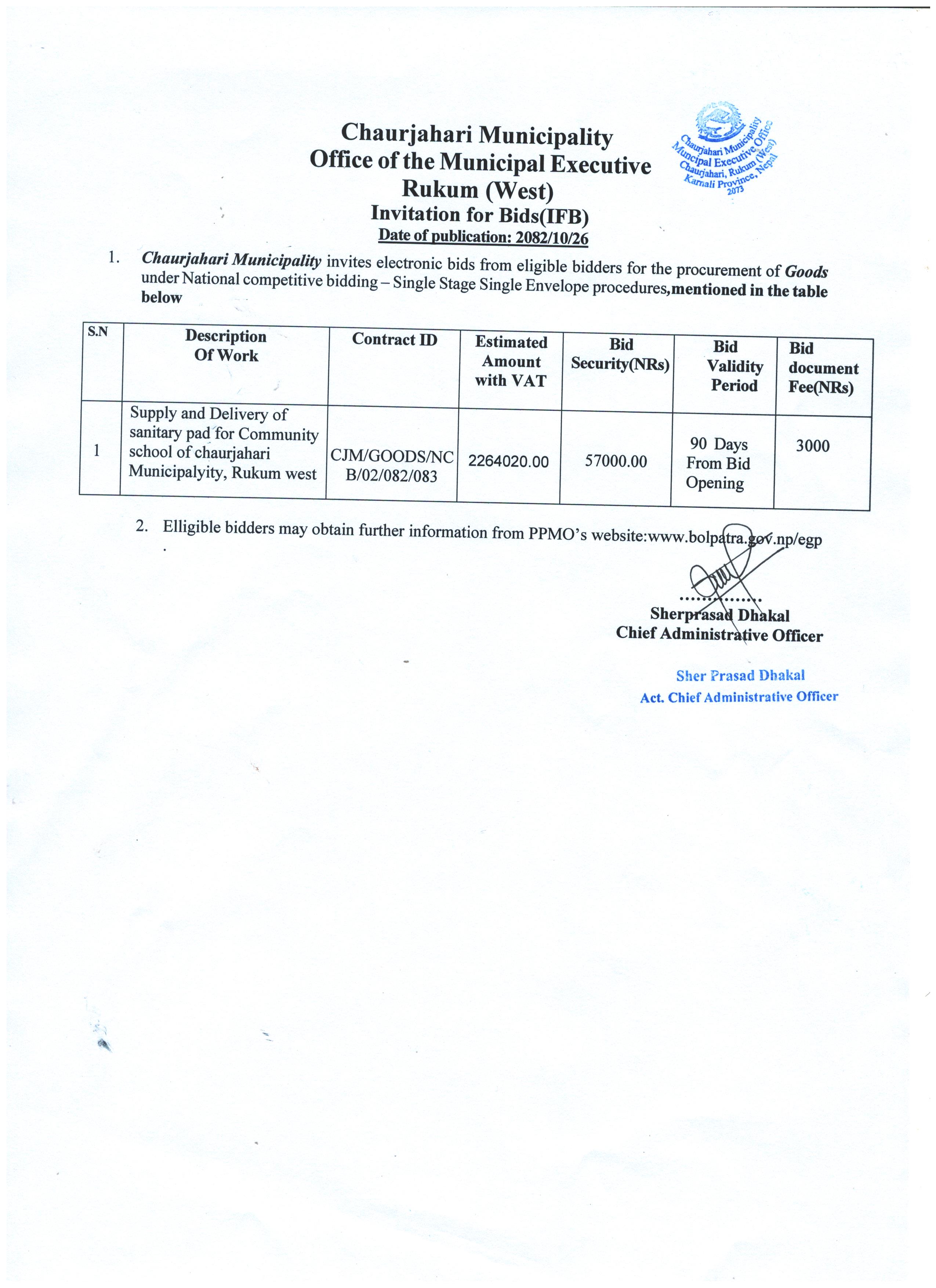 Home » सेनिटरीप्याड आपूर्तिका लागि विद्युतीय बोलपत्र आह्वान गरिएको सूचना !