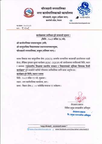 विकास निर्माणका काम कति सम्पन्न भए कति निर्माण अवस्था छन् र आगामि बर्ष कस्ता योजना आवश्यक पर्लान भन्ने् बिषयमा केन्द्रित रेडियो कार्यक्रम नगर सेरोफेरो हरेकहप्ताको आईतबार साँझ ६ः१५बजे देखी ६ः४५सम्म र पुन प्रशारण सोमबार बिहान ७ः३० देखी ८ः०० बजे सम्म आफ्नो एफ. एम ९०ं.४ मेगाहर्ज र सोमबार बिहान ६ः१५ देखी ६ः४५ बजे सम्म रेडियो चौरजहारी ९४.८ मेगाहर्जमा सुन्न नभुल्नुहोला । ०८८४०१११३, ९८४८२७५०७५ मा कार्यक्रम सम्बन्धि सल्लाहा सुझाब भए सर्म्पक गर्नुहोला