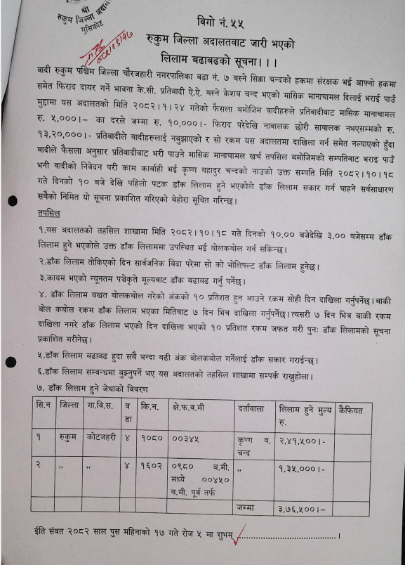 रुकुम जिल्ला अदालतबाट जारी भएको लिलाम बढाबढको सूचना !