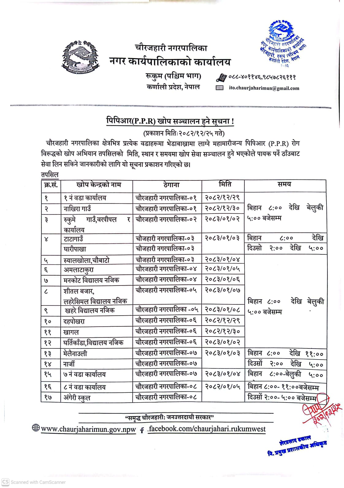 विकास निर्माणका काम कति सम्पन्न भए कति निर्माण अवस्था छन् र आगामि बर्ष कस्ता योजना आवश्यक पर्लान भन्ने् बिषयमा केन्द्रित रेडियो कार्यक्रम नगर सेरोफेरो हरेकहप्ताको आईतबार साँझ ६ः१५बजे देखी ६ः४५सम्म र पुन प्रशारण सोमबार बिहान ७ः३० देखी ८ः०० बजे सम्म आफ्नो एफ. एम ९०ं.४ मेगाहर्ज र सोमबार बिहान ६ः१५ देखी ६ः४५ बजे सम्म रेडियो चौरजहारी ९४.८ मेगाहर्जमा सुन्न नभुल्नुहोला । ०८८४०१११३, ९८४८२७५०७५ मा कार्यक्रम सम्बन्धि सल्लाहा सुझाब भए सर्म्पक गर्नुहोला