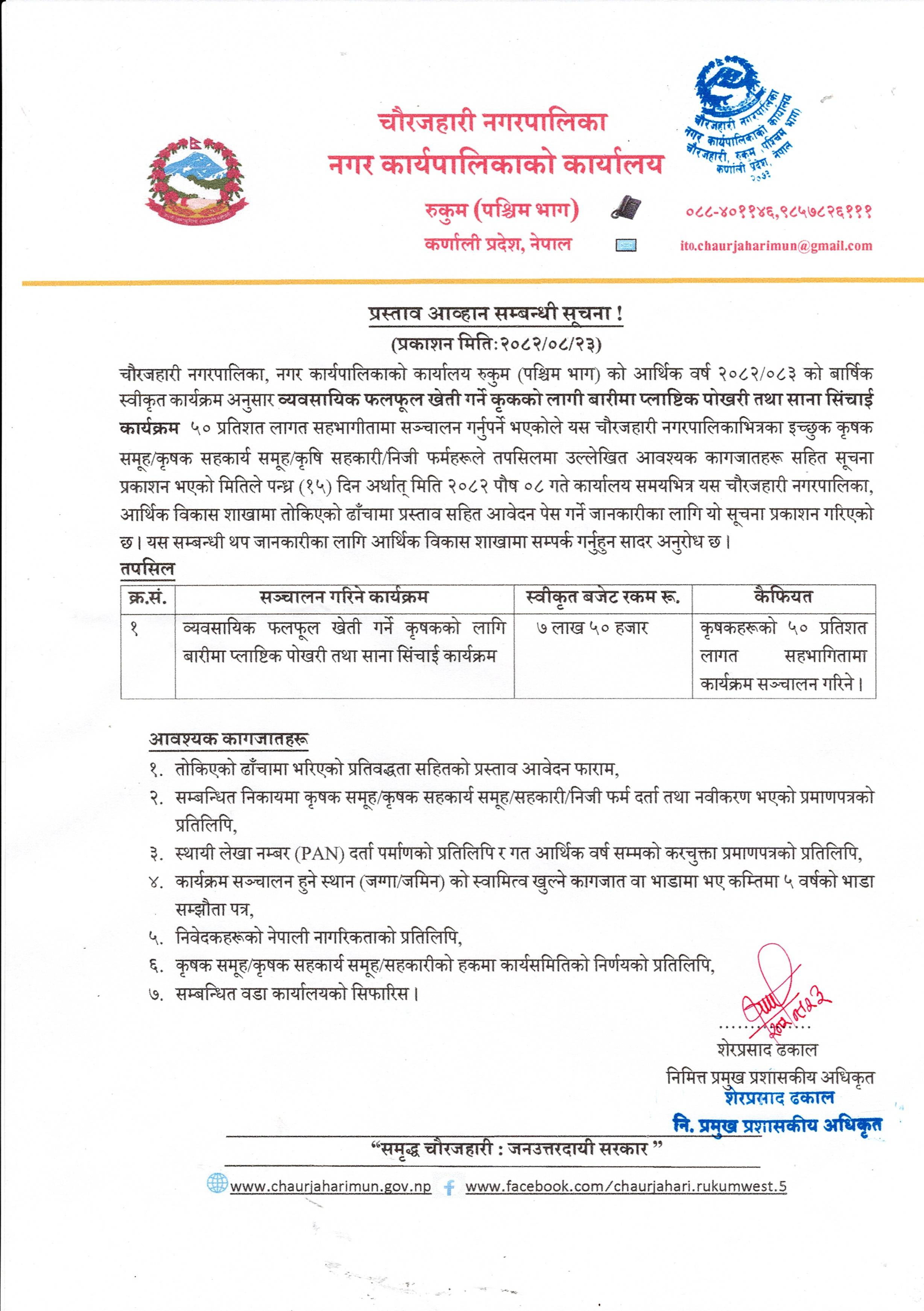 विकास निर्माणका काम कति सम्पन्न भए कति निर्माण अवस्था छन् र आगामि बर्ष कस्ता योजना आवश्यक पर्लान भन्ने् बिषयमा केन्द्रित रेडियो कार्यक्रम नगर सेरोफेरो हरेकहप्ताको आईतबार साँझ ६ः१५बजे देखी ६ः४५सम्म र पुन प्रशारण सोमबार बिहान ७ः३० देखी ८ः०० बजे सम्म आफ्नो एफ. एम ९०ं.४ मेगाहर्ज र सोमबार बिहान ६ः१५ देखी ६ः४५ बजे सम्म रेडियो चौरजहारी ९४.८ मेगाहर्जमा सुन्न नभुल्नुहोला । ०८८४०१११३, ९८४८२७५०७५ मा कार्यक्रम सम्बन्धि सल्लाहा सुझाब भए सर्म्पक गर्नुहोला