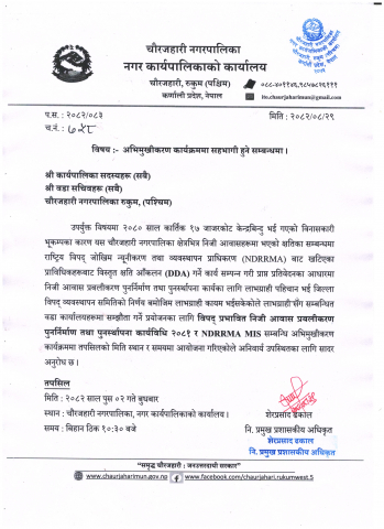 - मिति २०८१ माघ ७ गते सम्पन्न २० औं नगर सभाका प्रस्ताव तथा निर्णयहरु Post date: 08/04/2025 - 16:04 Updated date: Sun, 09/28/2025 - 17:02