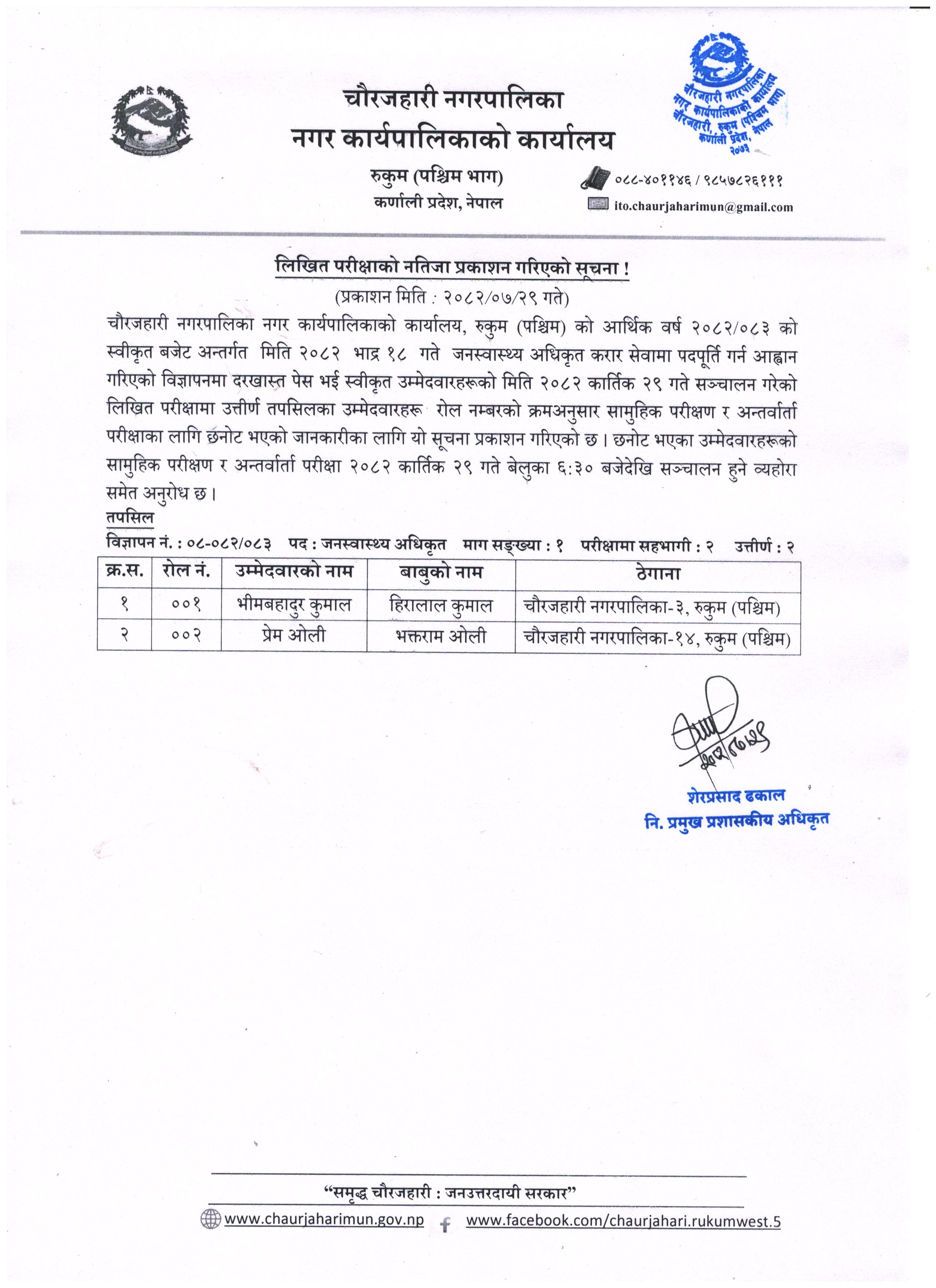 लिखित नतिजा प्रकाशन गरिएको सम्बन्धमा ।