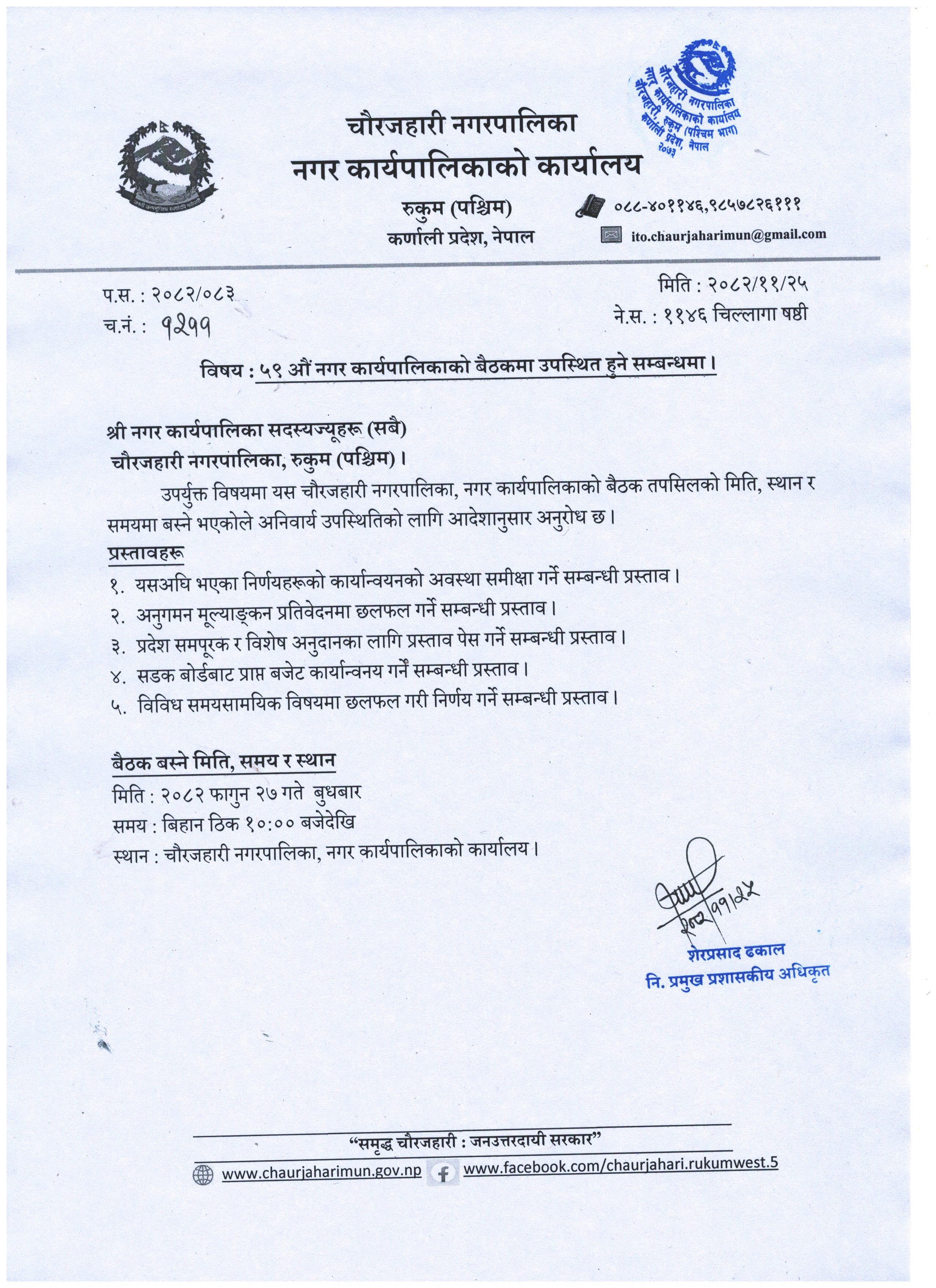 Home » ५९ औं कार्यपालिका बैठकमा उपस्थित हुने सम्बन्धमा ।